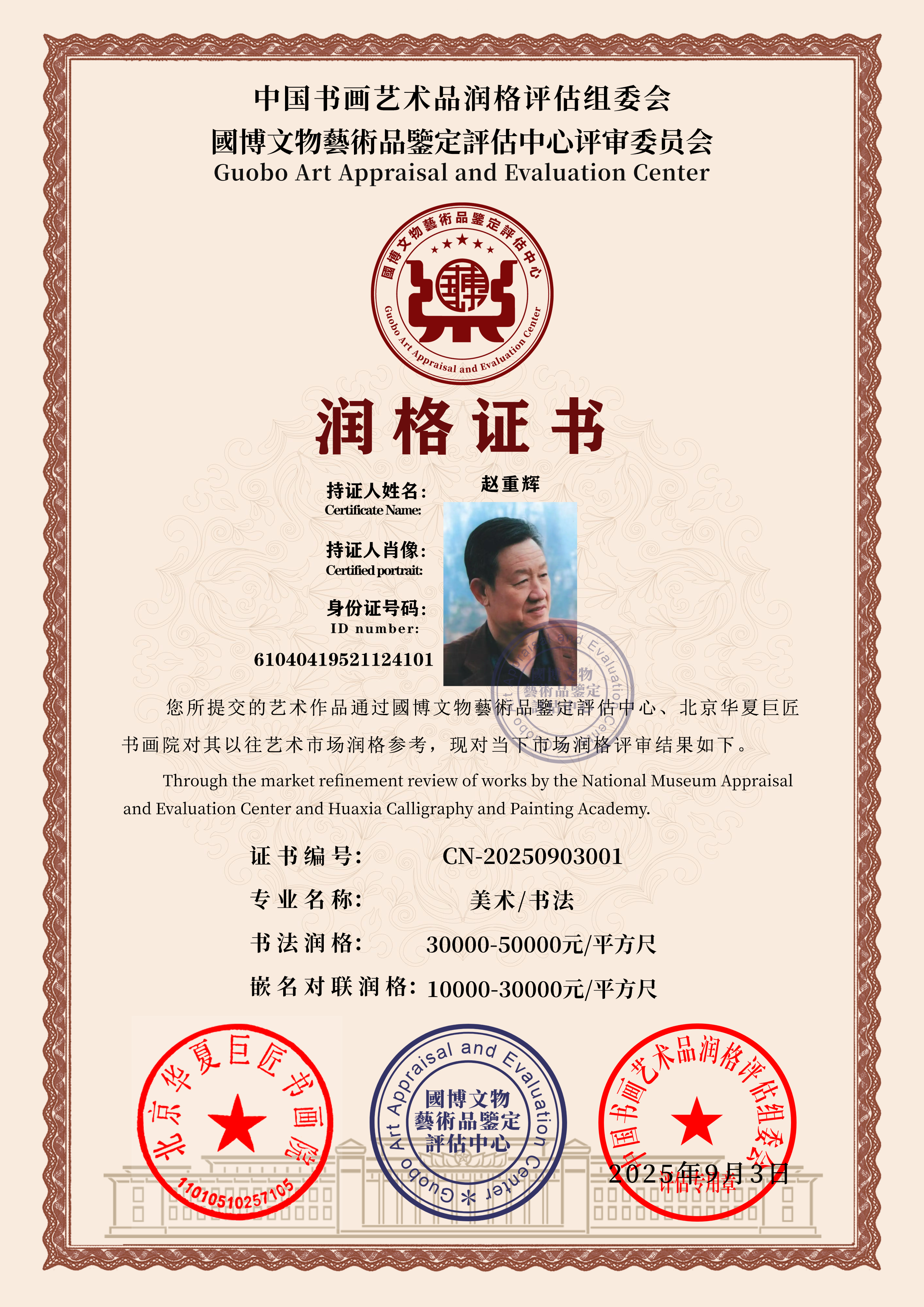 赵重辉(笔名赵辉),1952龙年生,陕西西安泾河新城人,祖籍山西,陕西省财院外贸经济系毕业,高级经济师,工农商学兵政均经历过。现任(香港)中华书画家协会常务副主席兼秘书长,中国书法家协会会员,深圳市长安书画艺术院院长,深圳市秦汉文化传媒发展有限公司董事长,中国艺术家杂志社陕西分社副社长、陕西省赵氏专业委员会会长、世界赵姓文史联研总会常务副主席。在深圳市福田区文化创意园E馆、西安省行政学院、咸阳市清渭楼广场、新疆乌鲁木齐、海南三亚、大连市、哈密和银川及广东新会等均设立书画工作室。自幼喜爱琴棋书画,擅长楹联创作和书法,3至5分钟可现场撰成嵌名对联。对联“泽雨无私润华夏,东风有意之庶民"(荣获金奖);为江西南昌“庐山杯”全国书画大赛嵌名对联“庐山紫气腾云字,瀑布天河写古今"(荣获一等奖);“铁肩担道义江山锦绣,巨手写春秋惠政涛清”,"习文近武圆国梦,淡定平心唱大风”。多次荣获全国及中日韩、中美等国内国际书画大赛金银大奖40余项,,2020年艺巡中华,《光辉时代杯书画大赛》,得票40.17万票,荣获《金奖》和《特等奖》。书法作品被国务院前副总理吴桂贤,蒙古国首任总统奥其尔巴特,世界佛教协会副主席金刚法王等收藏,已为国内外贤哲百姓撰书嵌名对联5万余幅。