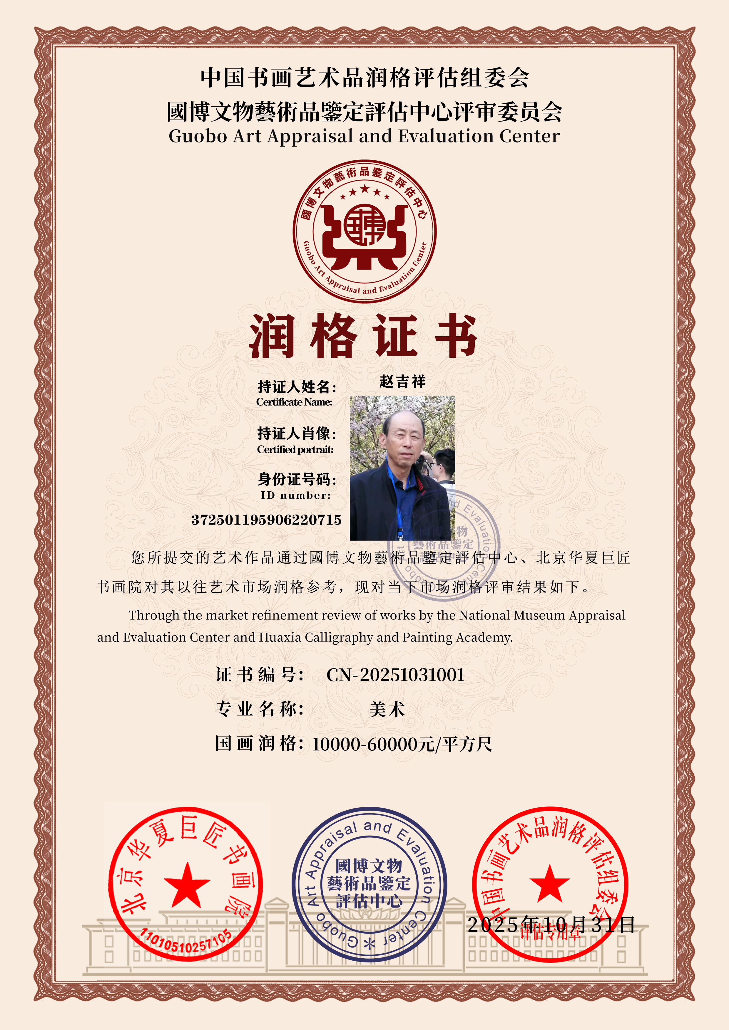 赵吉祥.(一九五九)山东聊城人,现为中国书画院院士,中国齐白石艺术研究会会员,齐白石孙媳朴喆老师门下弟子,中央军委,中国长剑将军书画院李小民付院长(办)秘书长。1975年入绘画班,己有50年绘画经历,酷爱绘画艺术,且涉猎广泛 ,山水花鸟、雕塑书法皆有所长,后专注于人物肖像画的创作与研究。国家一级美术师(有证书),一九八六年进修于浙江美术学院,受顾生岳大师影响颇深,崇拜蒋兆和、王子武、杨之光、李延声老师,勤奋研习,获益匪浅。