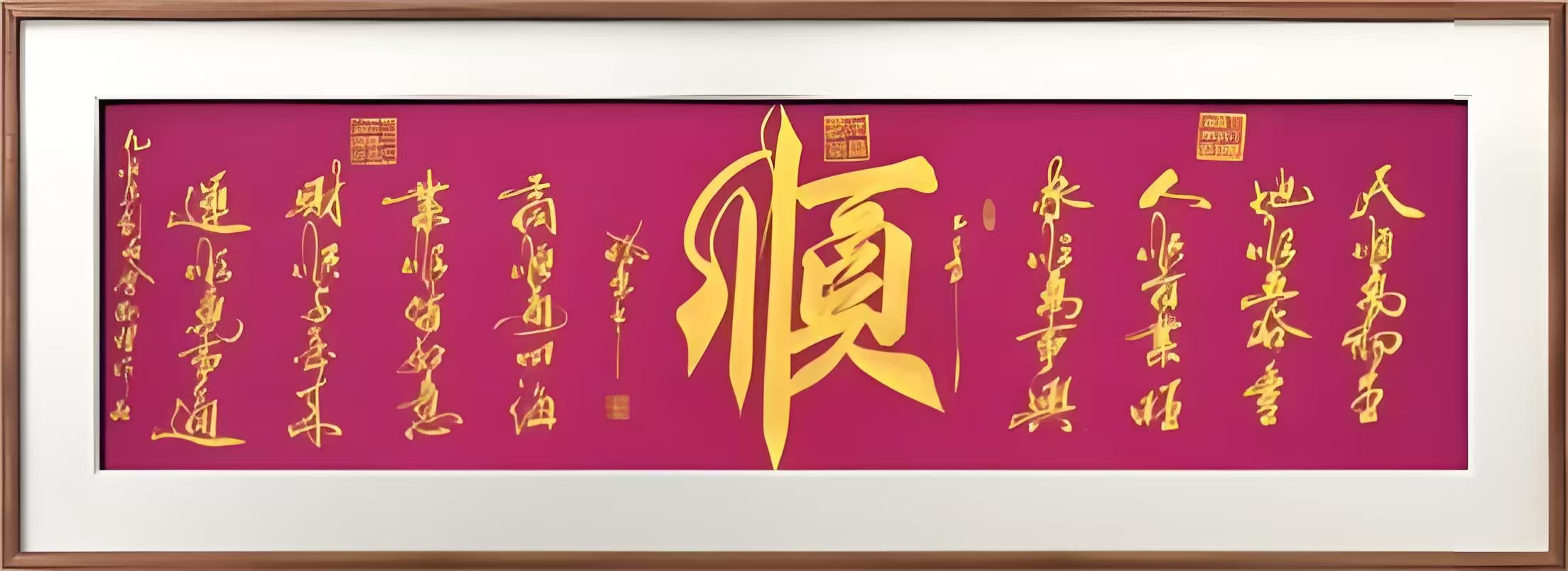 原创代表作品(九顺)被人民大会堂永久收录,顺字代表了我们中国人民向往美好,顺顺利利,一顺到底的寓意,人顺百业旺家顺万事兴,只有国顺我们才能享受今天的太平盛世